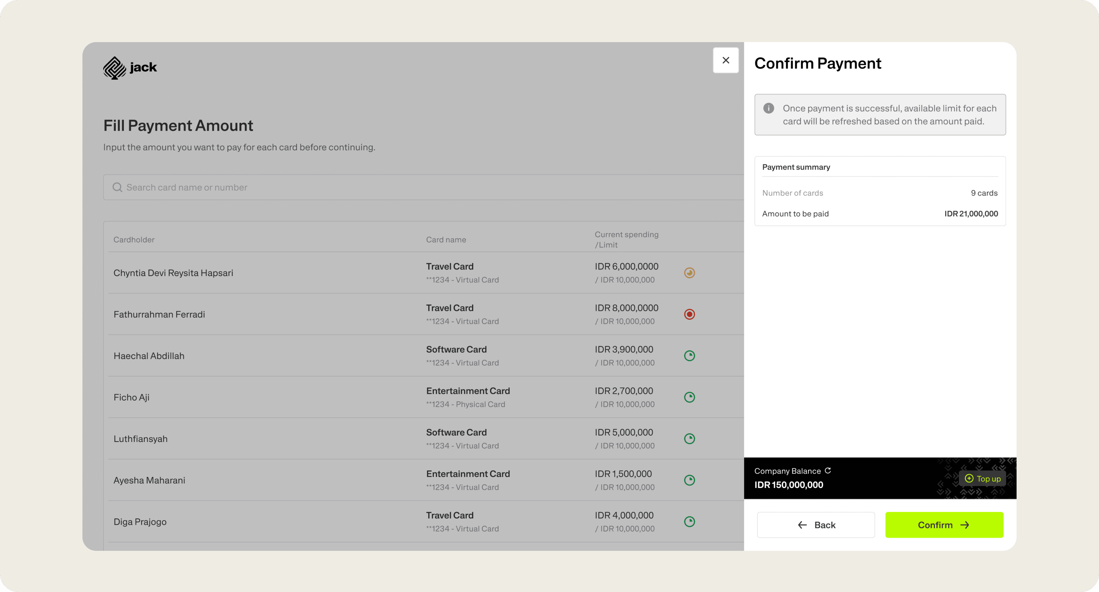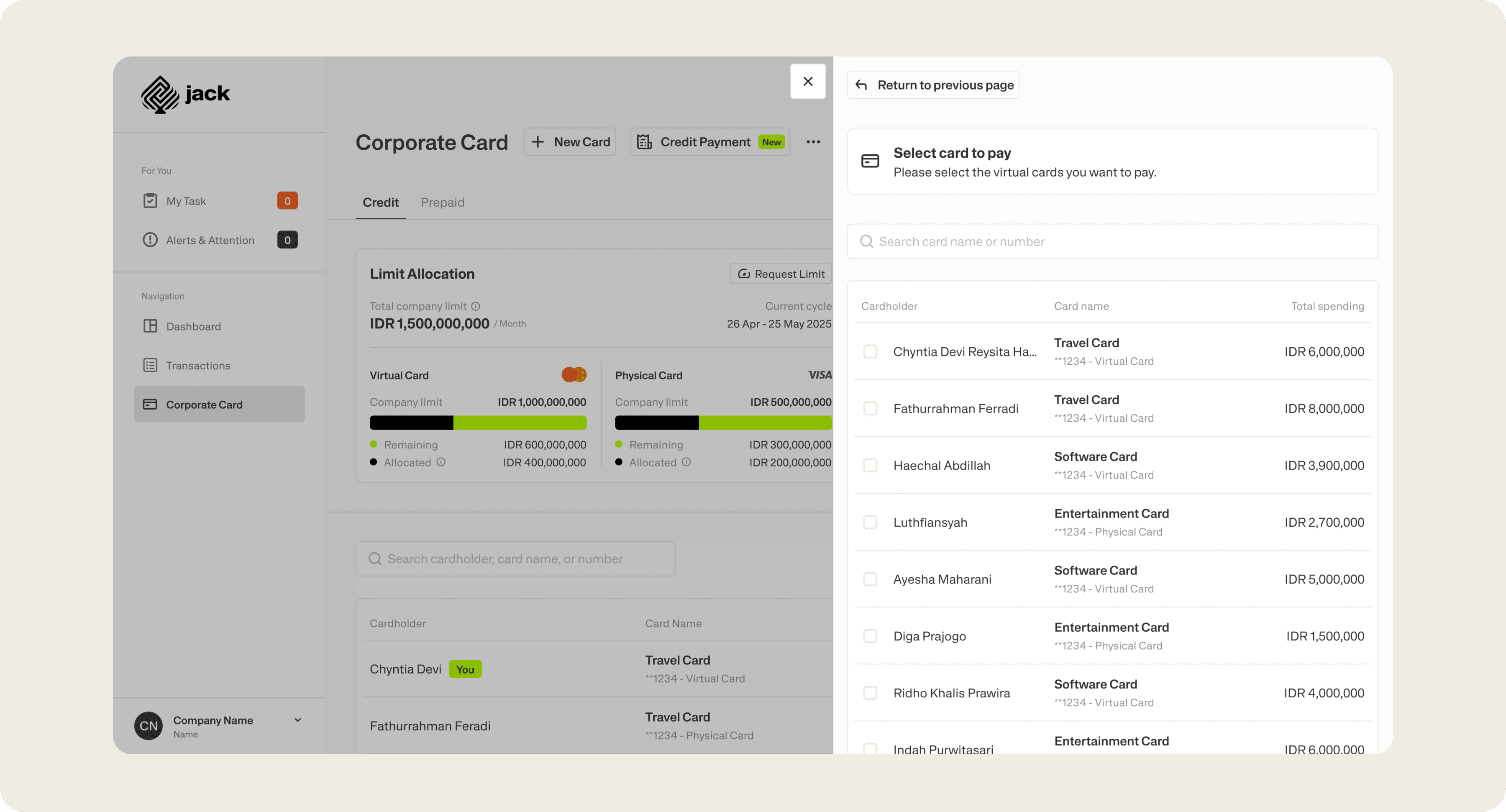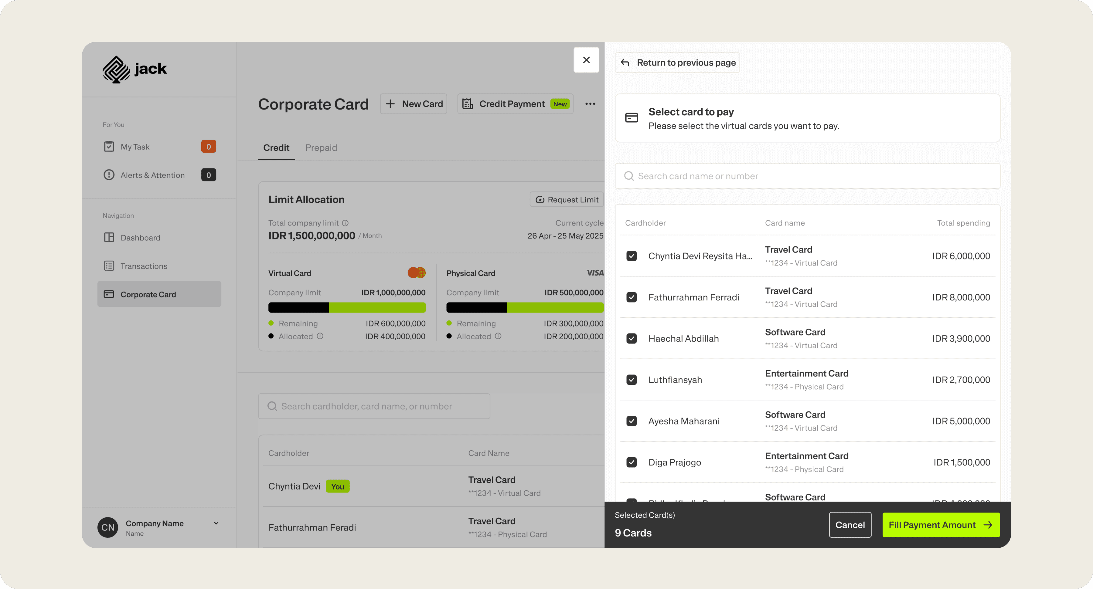 Allowed users to customize the payment amount for each card, without requiring full bill settlement, so limits can be managed and reallocated based on business priorities.
